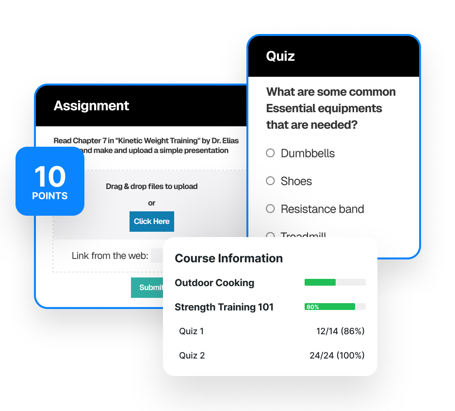 Add interactive learning assessments, like quizzes and assignments, that give students a chance to put the lesson into practice. Monitor their progress and review responses in the built-in Gradebook to see how theyโre connecting with your course content.